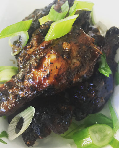 INGREDIENTS: Gluten free soya sauce (soy beans), rapeseed oil, white wine vinegar (sulphites), xanthan gum, golden syrup, black treacle, spring onion, scotch bonnet, chilli, thyme, onions, ginger, garlic, pimento (all spice), bay leaves, onion powder, garlic powder, paprika, coriander powder, salt, cumin, black pepper, muscovado sugar, mustard powder.